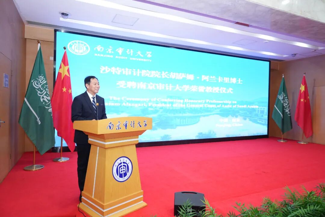 沙特审计院院长阿兰卡里教授致辞。他表示,受聘为南京审计大学荣誉教授,他深感自豪,更觉责任重大,这将激励他为深化沙特审计院与南审的合作贡献力量。阿兰卡里教授围绕沙特审计院的独立性、审计领域覆盖及国际影响力发表了主题演讲。他从沙特经济转型背景出发,系统阐述了沙特审计院在监督政府财政、评估政策绩效及优化公共资源方面的核心职能。他表示,沙特审计院在国际上不仅担任世界审计组织等多边机构的重要职务,牵头多项区域及国际审计事务,未来还将承担更多领导角色,持续提升其全球影响力。