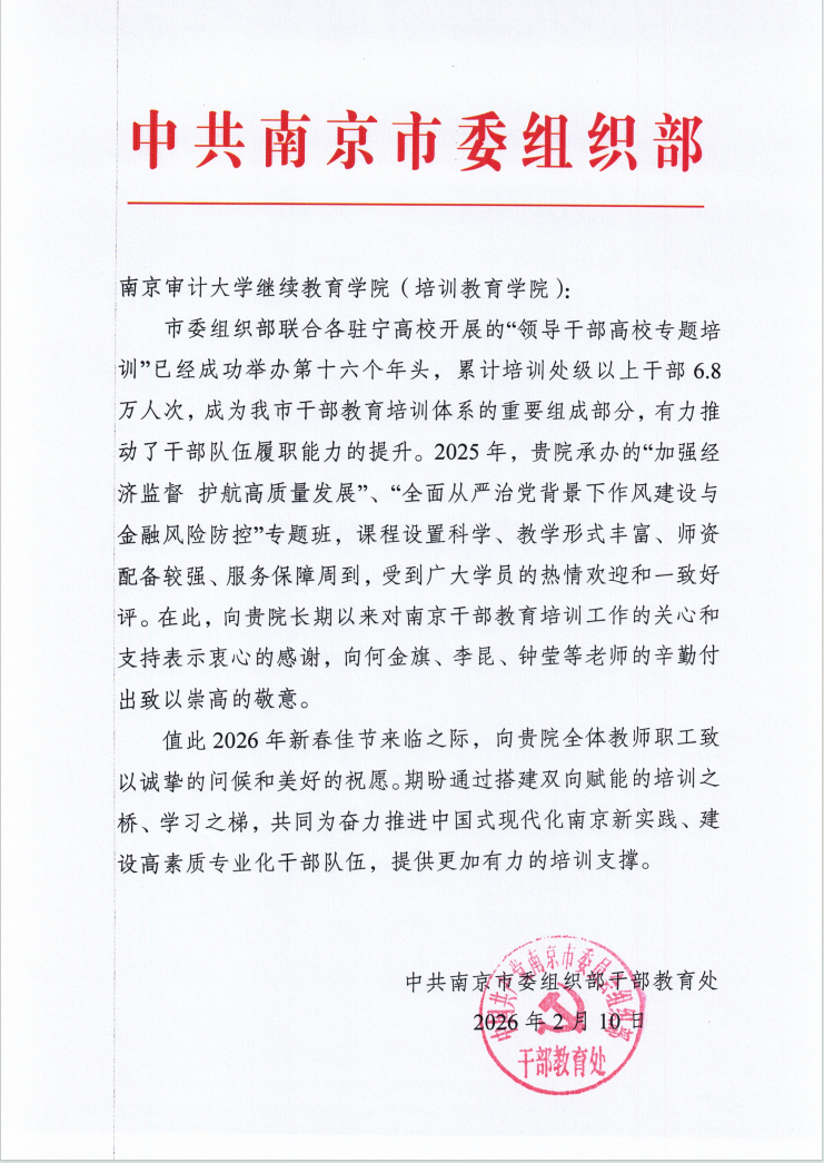 来信指出,市委组织部联合各驻宁高校开展的“领导干部高校专题培训”已成功举办十六年,累计培训处级以上干部6.8万人次,成为南京市干部教育培训体系的重要组成部分,有效提升了干部队伍的履职能力。2025年,学院承办的“加强经济监督护航高质量发展”和“全面从严治党背景下作风建设与金融风险防控”两个专题班,课程设置科学、教学形式丰富、师资配备较强、服务保障周到,受到参训学员的广泛欢迎和一致好评。
