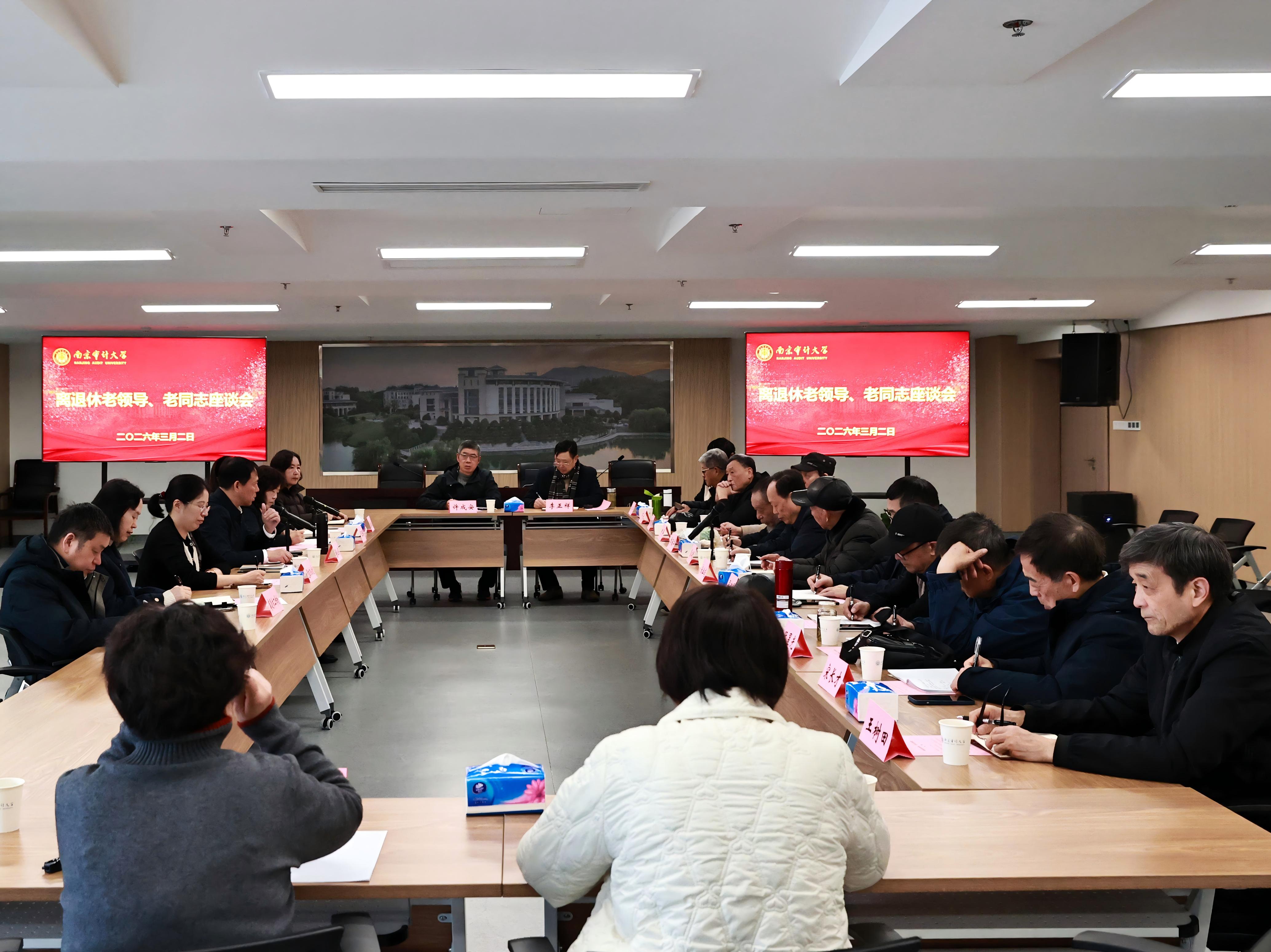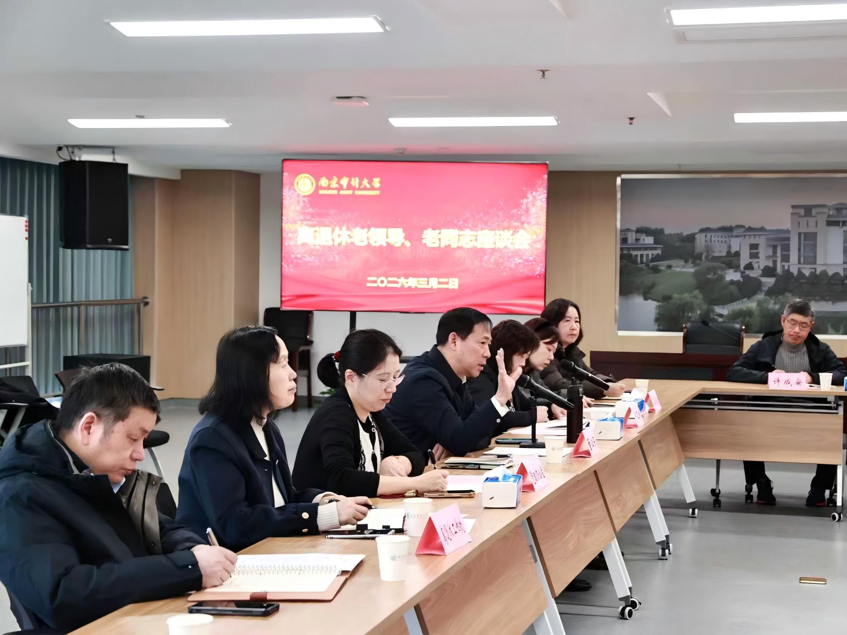 3月2日上午,我校在莫愁校区学员公寓502会议室召开了离退休老领导、老同志座谈会。校党委书记董必荣出席会议并讲话,党委常委、副校长卢亚娟主持会议。熊仁民、宋业成、乔春华、吴朝国、尹平、郭宏之等退休校领导,校退教协、老体协负责人,校关工委老同志委员,离退休各党支部书记,党政办公室、发展改革办公室、离退休工作处主要负责人参加。