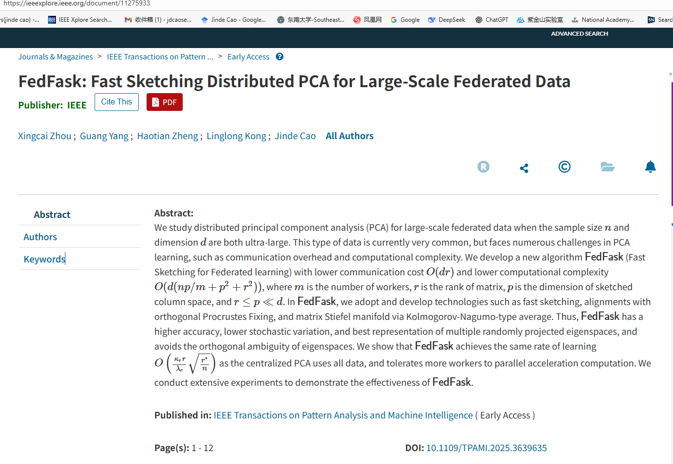 近日,南京审计大学统计与数据科学学院周兴才教授团队(博士生杨光和硕士生郑昊天)与加拿大阿尔伯塔大学孔令龙教授和东南大学曹进徳院士合作完成的学术论文“FedFask: Fast Sketching Distributed PCA for Large-Scale Federated Data”在线发表于人工智能顶级期刊IEEE Transactions on Pattern Analysis and Machine Intelligence (TPAMI)。该期刊科学引文索引影响因子为18.6,中科院分区一区顶级。研究成果主要聚焦于大尺度联邦数据的统计机器学习基础方法主成分分析(PCA)。作为最流行的线性降维工具之一,PCA能够从原始数据中提取主要信息,同时过滤无关信息。该方法已广泛应用于机器学习、统计学、信息检索、生物医学和图像处理等多个科学领域。当数据特征维度超高时,例如全基因组关联分析(GWAS)中特征可达数十万至数百万,这给传统PCA方法带来难以承受的通信负担和计算复杂度。研究提出了一种新算法 FedFask(Fast Sketching for Feder