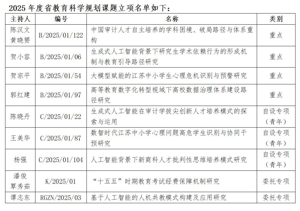 近日,江苏省教育科学规划领导小组办公室正式公布了2025年度省教育科学规划课题立项名单。我校共获批立项课题9项,其中重点课题4项,青年专项课题3项,委托专项课题2项。立项总数及重点课题立项数均位居全省同类高校首位。自课题申报工作启动以来,高等教育研究所(以下简称“高教所”)充分发挥其在学校教育科研发展中的“枢纽站”“服务器”和“指南针”作用。面对全校各学院、各部门教职工提交的39份高质量申报书,高教所全程服务,确保申报工作高效、规范与高水平推进。本次立项课题的研究范围多集中于审计特色、高等教育治理、人才培养模式创新等优势领域,体现了我校教育科研服务国家战略需求与学校中心工作的鲜明导向。此次省教育科学规划课题立项的成绩,是我校高度重视教育科学研究工作的集中体现,它提升了我校在教育科学领域的学术影响力,为推动我校教育教学改革、促进内涵式发展注入了新动能。