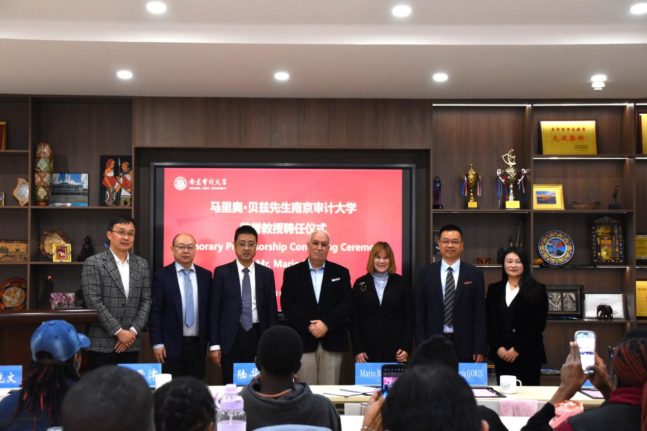 11月24日至28日,联合国问责司前副司长马里奥·贝兹到访我校,受聘南京审计大学荣誉教授受聘,并开展为期一周的交流座谈。11月24日,马里奥·贝兹受聘我校荣誉教授仪式在留学生院举行。纽约均衡组织执行董事法比奥拉·格里丝,校党委副书记、校长陆华良,党委常委、副校长李乾文,国际学院、留学生院相关负责人及留学生院审计专业硕士国际班留学生代表出席仪式。陆华良代表全体师生对马里奥·贝兹先生受聘表示热烈欢迎与衷心感谢。他指出,联合国是推动全球治理体系改革的重要平台。多年来,学校与联合国相关组织在审计项目合作、人才培养输送等方面取得了丰硕成果。此次贝兹先生作为资深联合国专家加盟我校,将进一步推动学校在审计与问责领域的国际对话与务实合作。我们期待以此为契机,持续深化南审与联合国系统的协同联动,共同为提升国际审计治理能力、促进可持续发展贡献专业智慧。陆华良为马里奥·贝兹佩戴校徽、颁发荣誉教授聘书。马里奥·贝兹对受聘为南京审计大学荣誉教授深感荣幸,并表示将积极履行荣誉教授职责,并与南审师生分享其在联合国系统三十余年的工作心得与实践经验。他引用《论语》中“学而时习之,不亦说乎”的经典名句,强调实