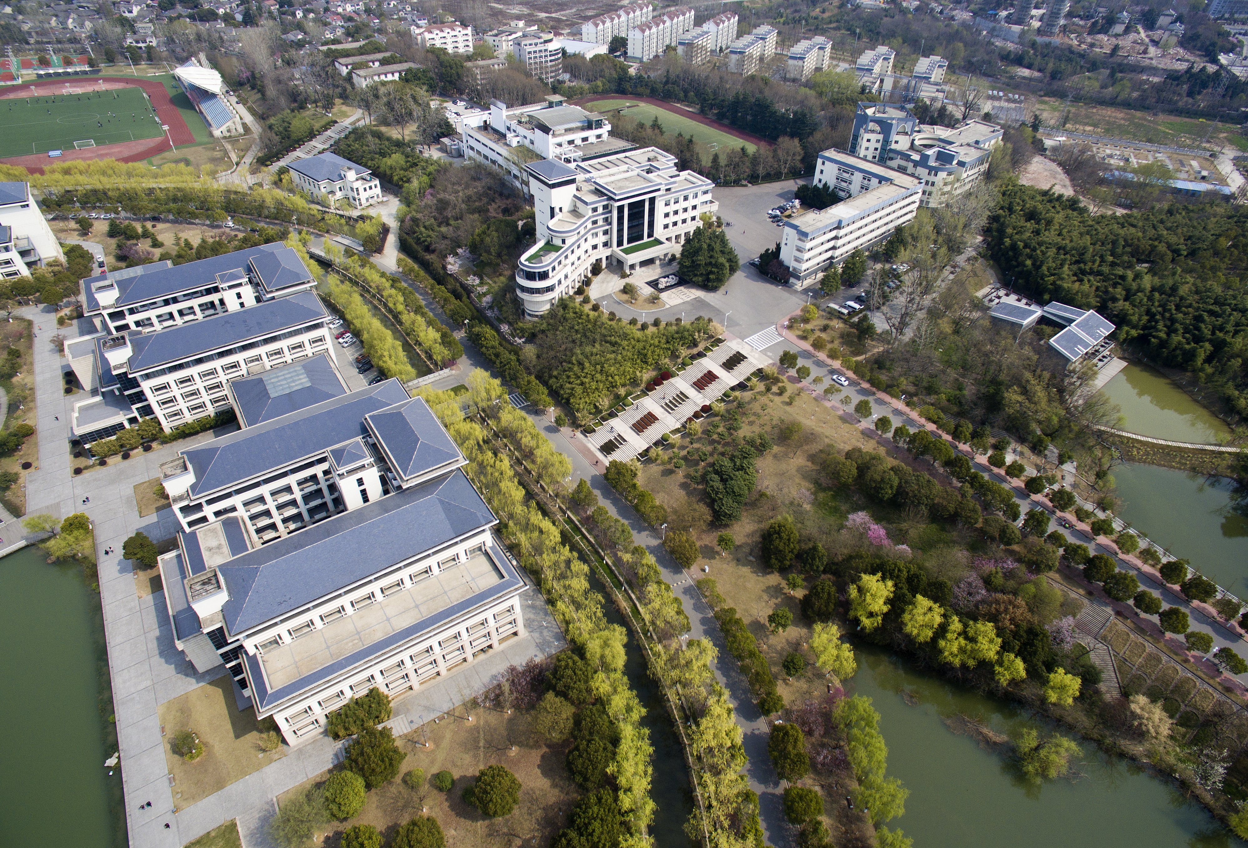 道路建设依山临水,随地势而蜿蜒,除校前区润泽大道为直行外,其余多为弧形,既减缓了车辆速度保证安全,更让人移步换景,在校园建筑物之中穿行,看的不只是人居场所的变化,更多的是山水姿态的变幻。