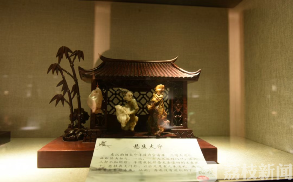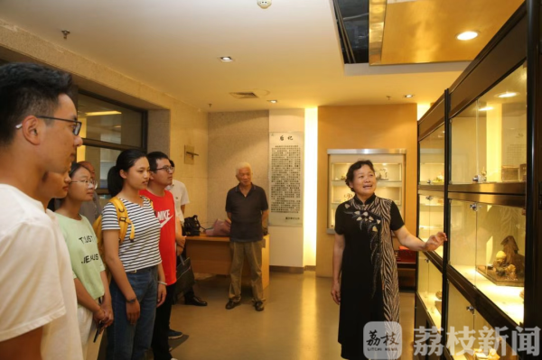 杨起顺的妻子徐立梅在石艺馆为师生讲解石艺作品↑