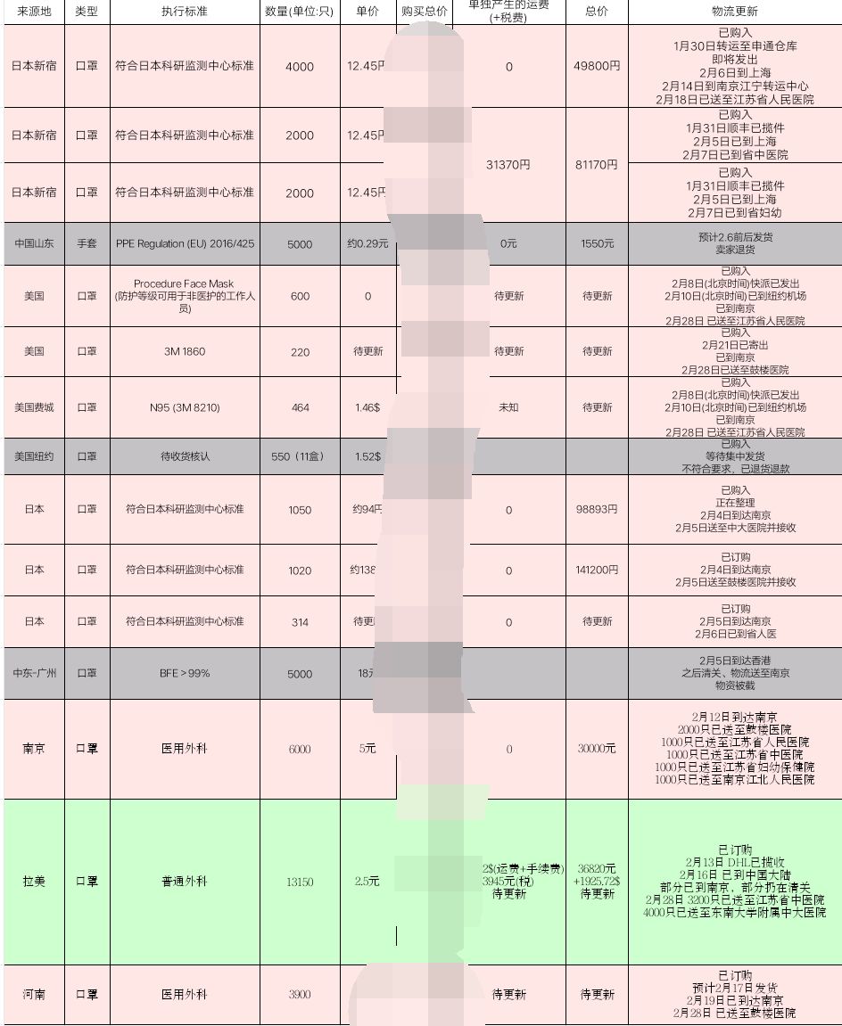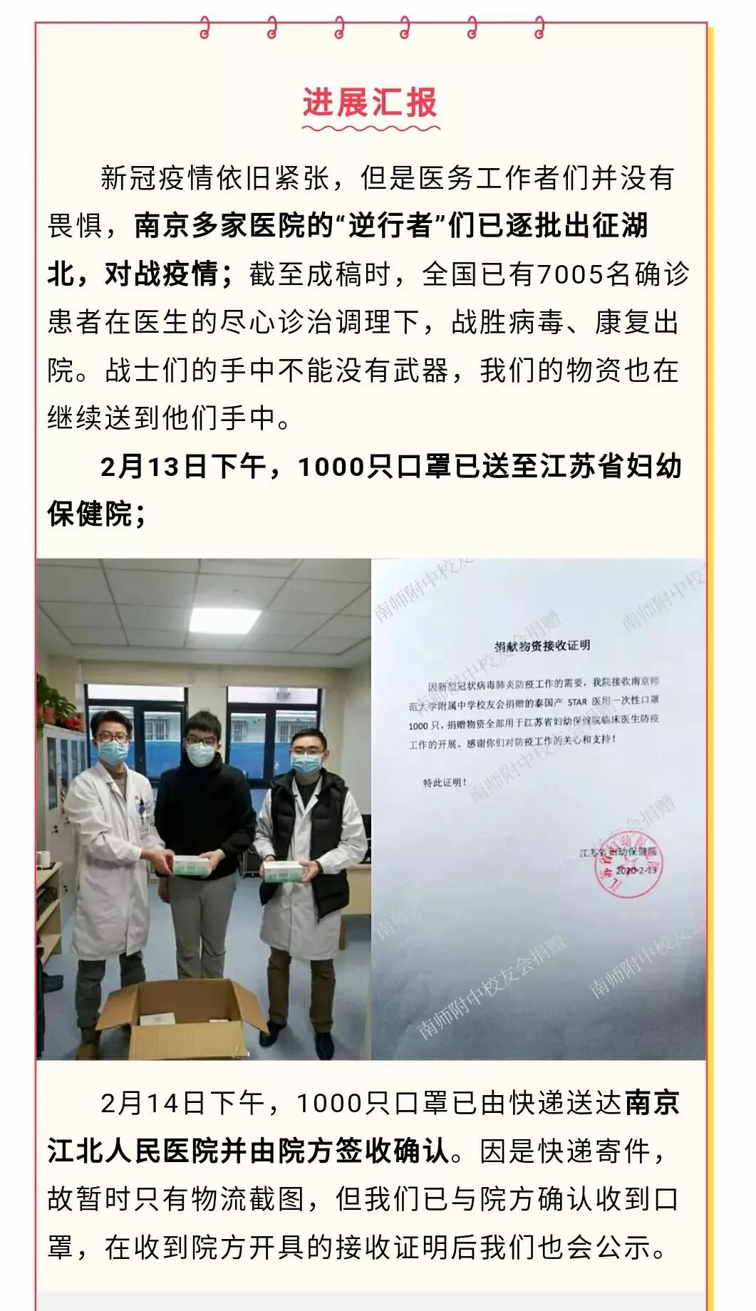 目前募集到的口罩已经陆续送到各医院,4000只口罩送至江苏省人民医院;3200只口罩送至江苏省中医院;4000只口罩送至东南大学附属中大医院;1000只口罩送至南京江北人民医院;4120只口罩送至南京市鼓楼医院;2000只口罩送至江苏省妇幼保健院。
