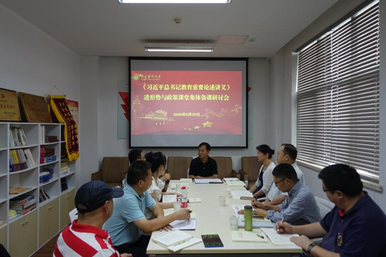 8月30日下午,马克思主义学院组织召开《习近平总书记教育重要论述》进课堂、进教材、进头脑集体备课会。党委常委、副校长董必荣、党委常委、宣传部部长强飙到会指导,教务委员会、马克思主义学院负责人和“形势与政策”课骨干教师参加会议。