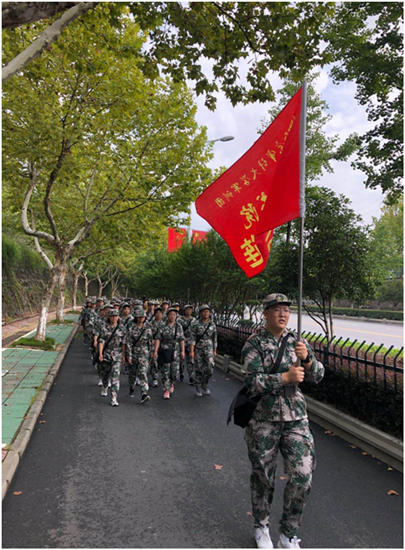 在拉练正式开始前,首先由教官整理队伍、鼓舞士气、宣布纪律。随后,军训学员在教官带领下排着整齐的队伍、迈着矫健的步伐,踏上了列队行军的旅程。在拉练中后期,有同学出现体力不支、即将落伍时,但在连队的队友们的相互鼓励、鞭策下,最后没有一人掉队、落伍,展现了南审学子坚韧积极的风采和互帮互助的精神。