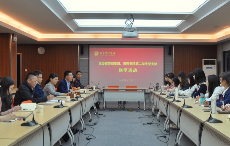 11月2日晚6点,党委宣传部支部与泽园书院第二学生党支部在中和楼502会议室开展联学活动。校党委常委、党委宣传部部长强飙,党委组织部副部长李海燕,信息工程学院党总支书记张勇,泽园书院党委书记孙军,党委宣传部副部长杨飞出席本次活动,党委宣传部支部党员和泽园书院第二学生支部的学生党员及积极分子代表参加了本次活动。联学活动由泽园书院党委书记孙军主持。