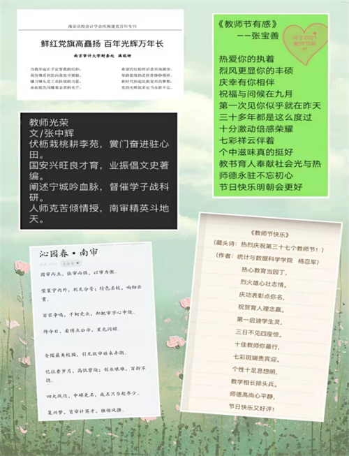 离退休处乔春华老师创作了文章《共产党人的初心和使命是党员学者不断前进的根本动力》,张宝善老师创作了诗歌《教师节有感》,潘纪明老师创作了散文诗《致中国共产党100年华诞的一首散文诗》;审计处王芳老师分享了《我与ACCA的情缘》故事;金融学院张中辉老师创作了诗词《教师光荣》;数学与统计学院杨忍军老师创作了藏头诗《热烈庆祝第37个教师节》;人事处满瑞妍老师创作了诗歌《鲜红党旗高矗扬 百年光辉万年长》…… 老中青三代教师汇聚一堂,薪火相继,用深情美好的诗句、隽永优美的文笔、发自肺腑的真情表达对南审的热爱,对教育事业的眷恋以及对党和国家的忠诚与担当!