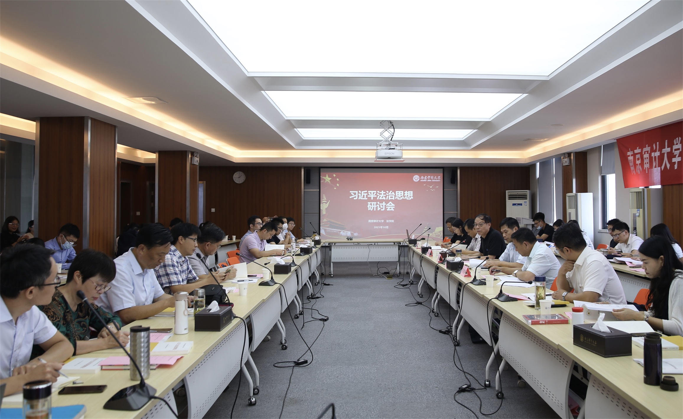 中央全面依法治国工作会议首次明确提出了“习近平法治思想”概念,并揭示了习近平法治思想中的三大逻辑,即实践逻辑、理论逻辑和历史逻辑之间有机统一的关系。为深入学习习近平法治思想,10月9日上午,南京审计大学召开了习近平法治思想研讨会,南京审计大学党委副书记、校长刘旺洪教授等法学学科教师近60人出席会议并参与研讨。