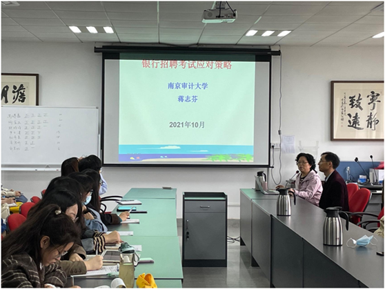 蒋志芬在讲座中介绍了银行招聘的相关流程及招聘要求,讲解了应聘简历的制作、网申技巧、笔试备考要点、面试基本礼仪,以及面试脱颖而出的技巧等。在指导笔试环节,蒋志芬建议同学们要关注时政热点,了解政府出台的重大政策,夯实专业知识,丰富知识储备,熟悉报考单位的基本情况,研究各银行的出题风格。另外,蒋志芬还介绍了近年来十几家商业银行的笔试题的部分内容。并且以去年南京银行、农业银行、建设银行面试题为例,介绍了无领导小组讨论、结构化和半结构化面试、正反方辩论等面试的关键要点,为学生求职提供了丰富的建议。最后,蒋志芬向大家送出了衷心的祝福,祝福同学们如愿进入理想的工作岗位,收获幸福人生。