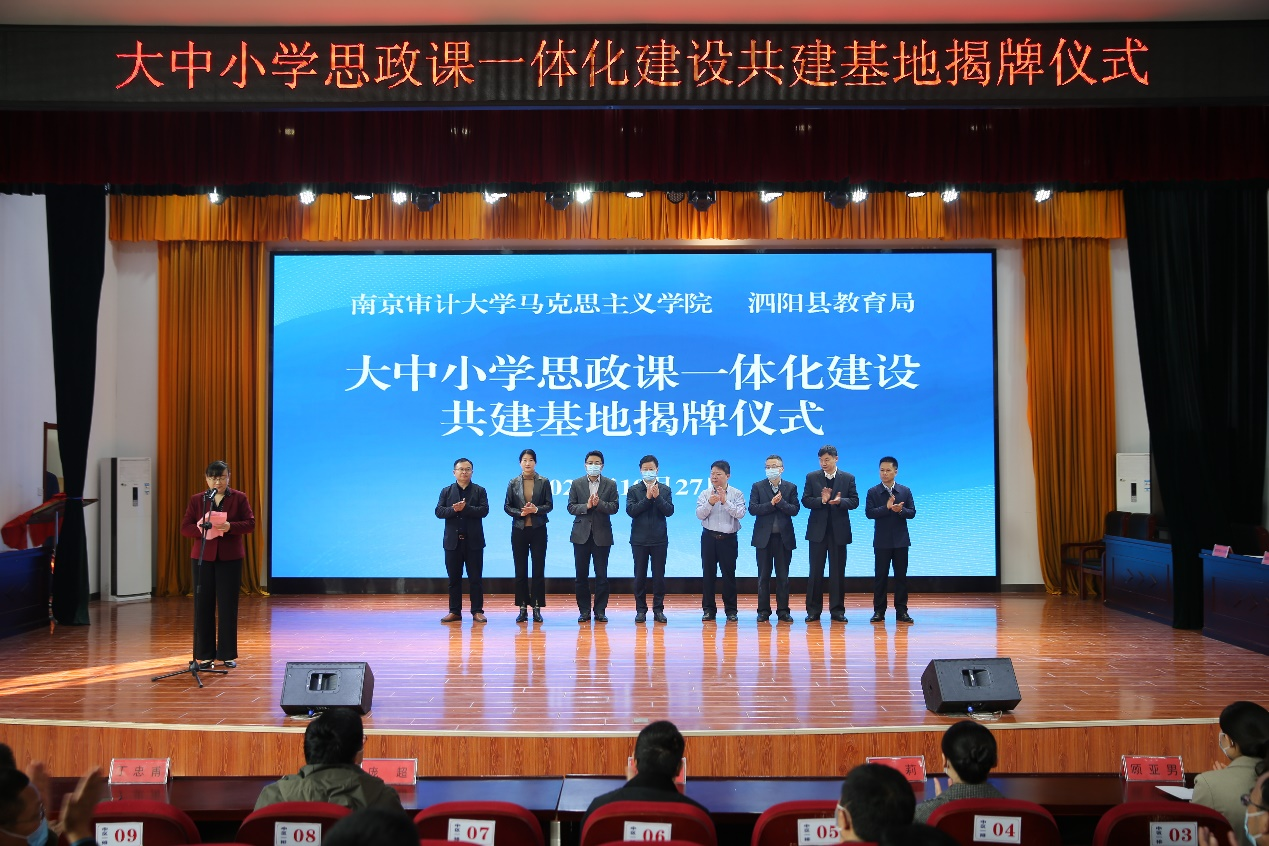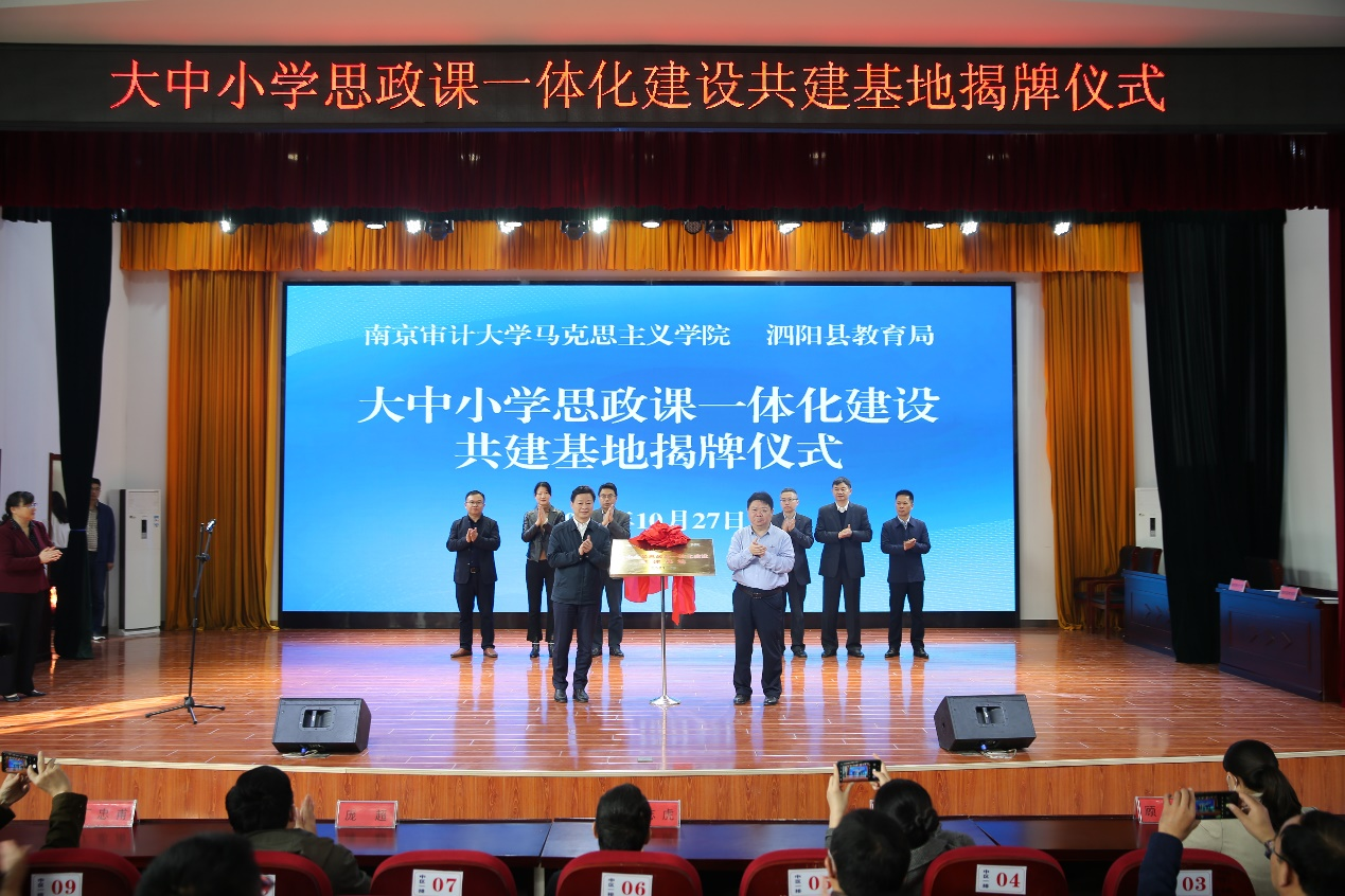 为深入学习习近平新时代中国特色社会主义思想,贯彻中共中央办公厅、国务院办公厅《关于深化新时代学校思想政治理论课改革创新的若干意见》等文件精神,积极落实大中小学思政课一体化教学改革创新,10月27日上午,我校与泗阳县教育局共建大中小学思政课一体化教学改革创新基地揭牌仪式在泗阳县上海路初级中学报告厅举行。南京审计大学党委副书记张建红等一行10人,泗阳县人民政府副县长张祥瑞,泗阳县教育局县委教育工委委员、教师发展中心副主任葛庆中以及泗阳县各中小学校长等参加揭牌仪式。仪式由泗阳县教育局局长胡梅主持。