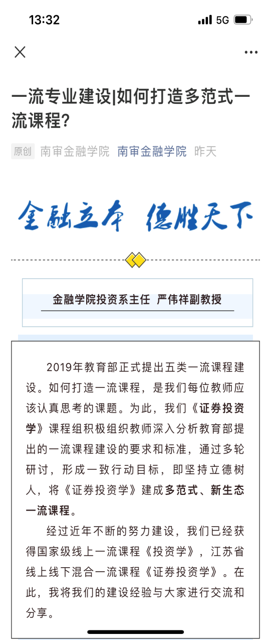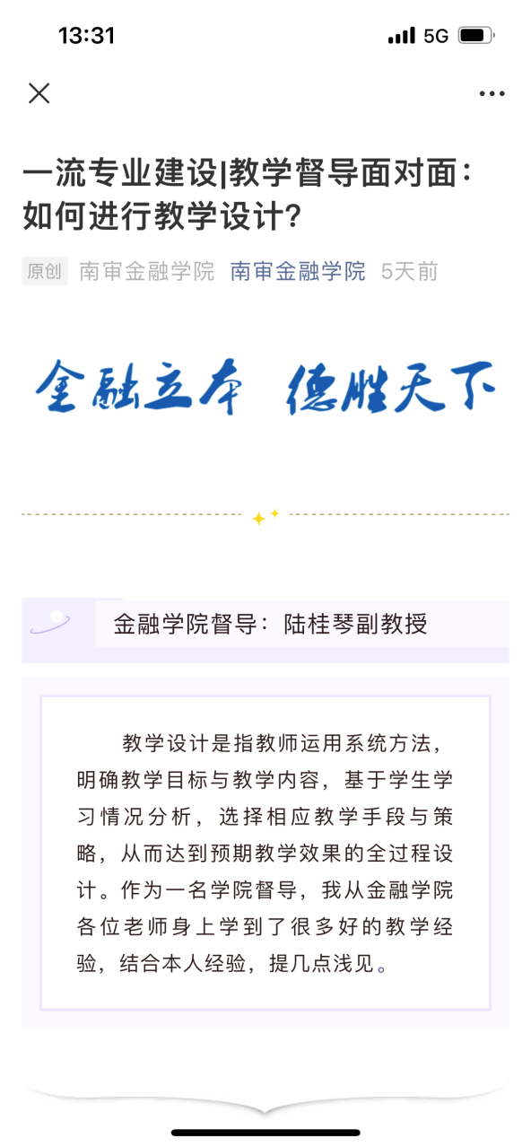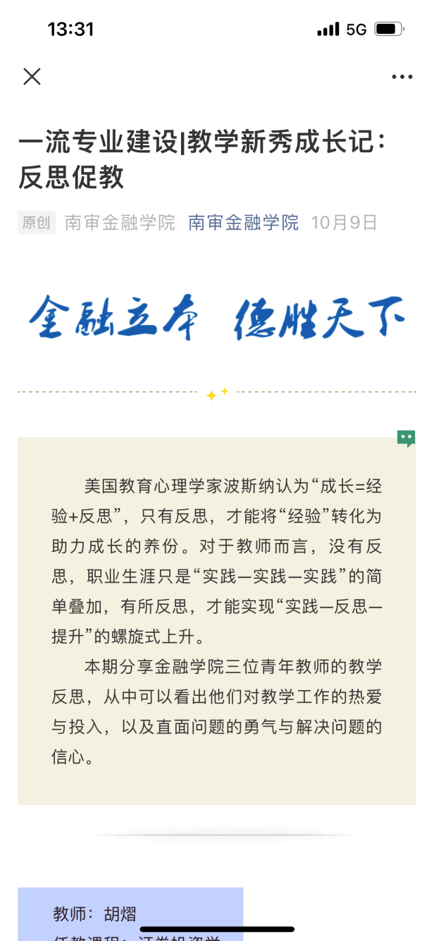 为积极推进学院一流专业建设,提升学院教师授课水平,学院近期在官微进行了一系列专题推送,主题分别为:“教学新秀成长记:反思促教”“教学督导面对面:如何进行教学设计?”“教学创新:浸润式教学模式探索”和“如何打造多范式一流课程?”。通过青年教师们的教学心得与反思总结、学院督导对于教学设计的心得与示范、优秀教师郭岚的浸润式教学模式的探索、“证券投资学”多范式新生态一流课程的引领,进一步推动学院第一课堂改革,达到了反思促教、示范促教的良好效果。