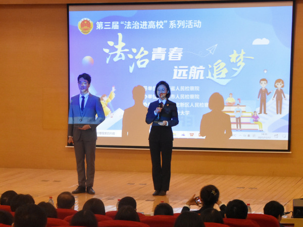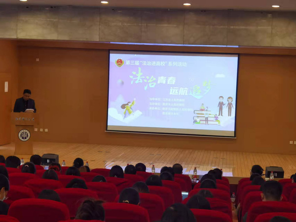 11月17日下午由江苏省人民检察院指导,南京市人民检察院主办,南京江北新区人民检察院与南京审计大学承办的“法治青春 远航追梦”第三届“法治进高校”活动在敏达报告厅举办。此次活动由龙虎网全程直播,全市26万余大学生在线观看。省人民检察院第八检察部副主任毛建忠、省人民检察院第四检察部员额检察官王燕、市人民检察院副检察长程序、市人民检察院第八检察部主任徐莉、江北新区检察院检察委员会专职委员何立超,我校党委常委、党委宣传部部长强飙、党委保卫部部长李海、法学院党委书记刘宏宇、法学院实践教学中心主任秦康美及百余名大学生参加了此次活动。