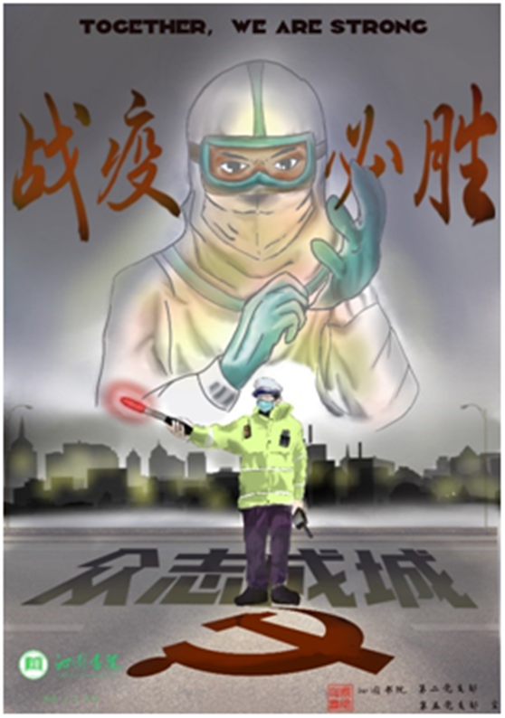 “疫情防控宣传”活动组织学生党员们集思广益,制作了一幅以抗击疫情为主题的宣传海报。海报以抗疫一线的医护人员、交通警察为背景,同时加之以戴手套的动作,和戴口罩的手势来向广大师生传递抗疫有我的精神。海报制作完成后学生党员们将海报张贴在沁园书院的主席台下、食堂出口处等较为显眼的地方,时刻督促学生勤洗手、戴口罩。