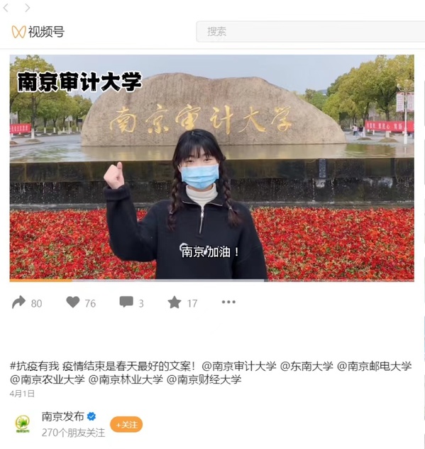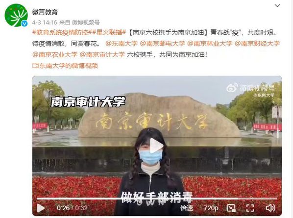 教育部官方微博、南京发布视频号转载我校抗疫视频