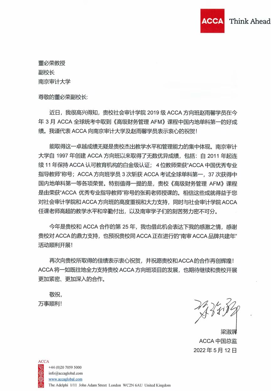 近日,我校收到ACCA中国总监梁淑屏女士发来的贺信。社会审计学院2019级ACCA班赵雨馨同学在今年三月ACCA全球统考中获得《高级财务管理 AFM》中国内地单科第一的好成绩。截至目前,我校ACCA学子在全球统考中,已有3人获得单科成绩全球第一、38人次获得中国内地第一。