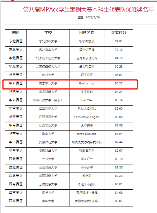 近日,2022年(第八届)MPAcc学生案例大赛本科生组落下帷幕。南京审计大学2019级财务管理专业包昕梦、郁圳乐,2019级会计学专业李静、张誉杰组成的本科生团队——“Brains trust”,在全国571个本科参赛队伍中以85.22分成绩位列全国第二名。