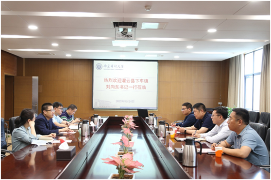 5月24日,灌云县下车镇党委书记刘向东一行来校调研对口帮促工作。校党委常委、组织部部长李乾文,实验中心主任刘玉、副主任杨琴等热情接待了刘向东一行,并在中和楼401会议室举行座谈会。