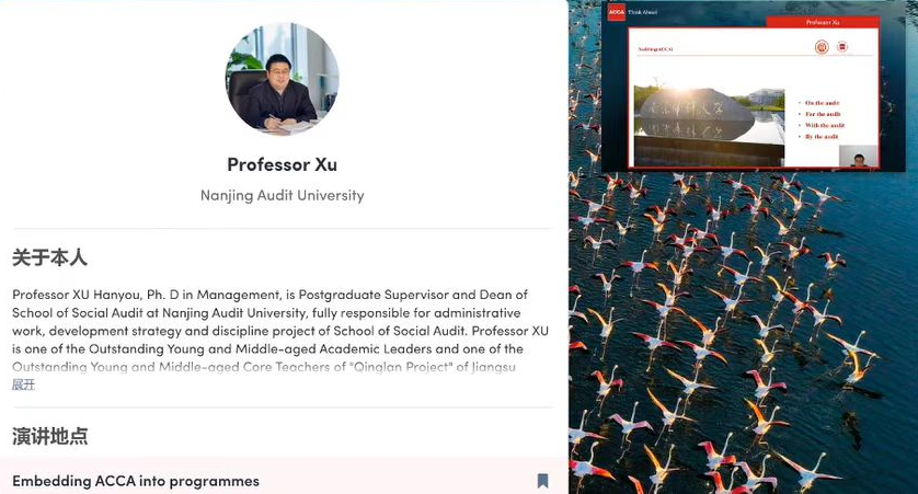 ACCA特别邀请我校社会审计学院院长许汉友教授参加该次峰会,并分享中国高校ACCA合作办学模式。许汉友从我校的发展历史谈起,介绍了社会审计学院、审计学(ACCA)专业的创立和发展历史、审计学(ACCA)专业所取得的办学成果和荣誉,重点介绍了我校特色的学历教育与职业资格认证相结合的办学模式、ACCA课程嵌入审计学人才培养方案等具体做法。同时,他还展望了新时代双循环发展格局下中国高校合作办学项目应有的变革与创新,最后还对世界各地审计同仁前来访问、合作表达了欢迎之情。