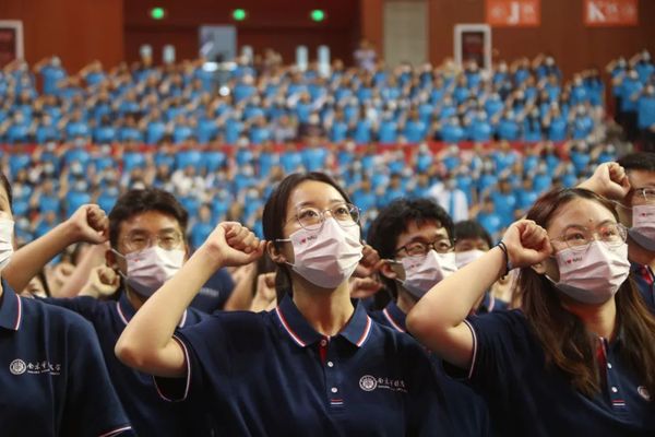 在新生代表的带领下,全体新生庄严宣誓。“用青春的风采扮靓今天的母校,用优秀的成绩贡献祖国的明天!”