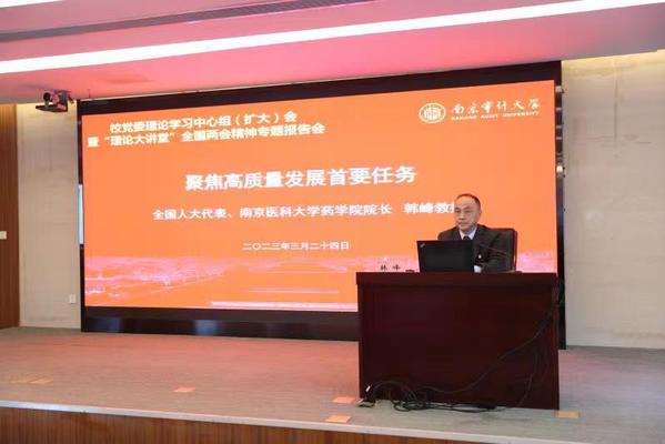 3月24日下午,我校党委理论学习中心组(扩大)会暨 “理论大讲堂”专题报告会在中和楼414报告厅举行,围绕深入学习全国“两会”精神主题,全国人大代表、南京医科大学药学院院长韩峰教授应邀作《聚焦高质量发展首要任务》专题辅导报告。全体在校校领导、党委常委出席,两委委员、二级党组织书记、全体中层干部参会,校党委常委、党委宣传部部长强飙主持了报告会。