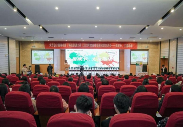 会上,大华会计师事务所授予南京审计大学“英才计划院校——英才大本营”荣誉牌匾。研究生党员代表孙彤作为代表发言。她表示,作为未来的“审计人”“会计人”必须矢志不渝坚守职业道德,立志成为有理想、敢担当、能吃苦、肯奋斗的新时代好青年。同学们还围绕专业实习和就业需求,与大华会计师事务所的招聘团队进行了热烈的互动交流。