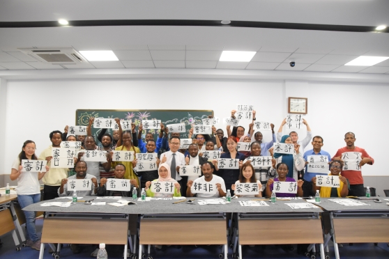 书法学习结束后,国际学院党总支书记江振春寄语毕业留学生。他希望大家回国后能够充分利用在南京审计大学学到的理论和实践知识,为本国审计事业发展做出积极贡献。江振春与张文秀共同为毕业留学生颁发精心准备的纪念品,并与留学生合影留念。