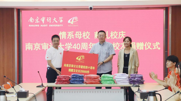 9月6日下午,南京审计大学四十周年校庆文化衫捐赠仪式在中和楼502会议室举行。苏美达江苏长江纺织品贸易有限公司总经理徐剑(96级审计专业校友)、总经理朱薇(99级国际贸易专业校友)、副校长李乾文及师生代表参加捐赠仪式,校友联络办公室副主任张林林主持本次活动。