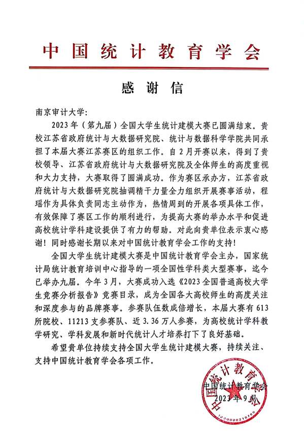 近日,2023年(第九届)全国大学生统计建模大赛成功举办,大赛主办方中国统计教育学会向我校发来感谢信,对我校江苏省政府统计与大数据研究院、统计与数据科学学院在承办江苏赛区组织工作中所提供的有力保障予以充分肯定,向我校为提高大赛举办水平和促进高校统计学科建设提供的有力帮助表示衷心感谢。