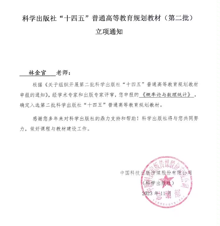 近日,科学出版社公布了“十四五”普通高等教育规划教材(第二批)立项名单,我校林金官教授申报的《概率论与数理统计》入选第二批科学出版社十四五普通高等教育规划教材。