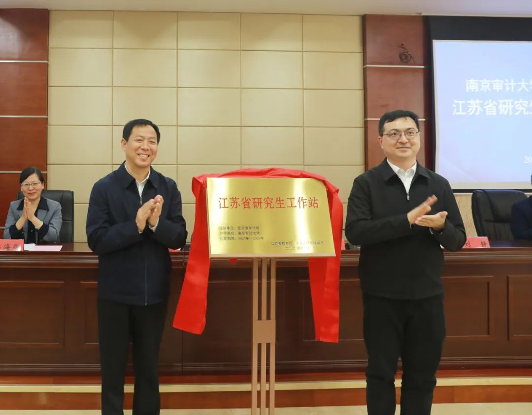 4月13日,南京审计大学与宜兴市审计局合作成立研究生工作站,我校党委书记董必荣与宜兴市人民政府副市长吴苏舒为“江苏省研究生工作站”揭牌,宜兴市审计局党组书记、局长赵辉,宜兴市审计局全体审计干部及部分单位内审负责人、宜兴市审计学会会员代表共同见证这一重要时刻。