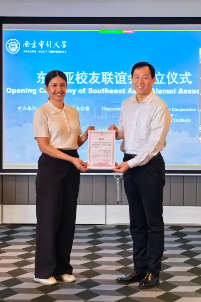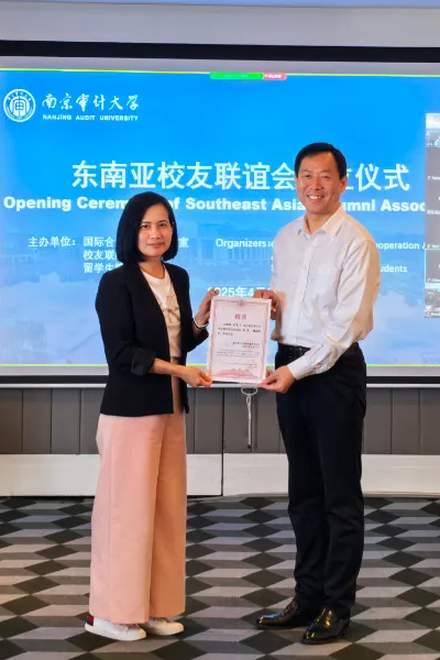 2016级校友林苏贝(现任泰国达叻府审计部门主管)担任南京审计大学东南亚校友联谊会会长、2017级校友苏珊担任秘书长,董必荣为校友联谊会颁发聘书。董必荣表示,东南亚校友联谊会的成立是我校国际合作与交流工作、校友联络工作以及留学生教育管理工作中具有里程碑意义的一件大事,东南亚各国校友将通过校友联谊会平台,开展更为深入的合作与交流,为各国审计事业发展和国际治理贡献智慧与力量。