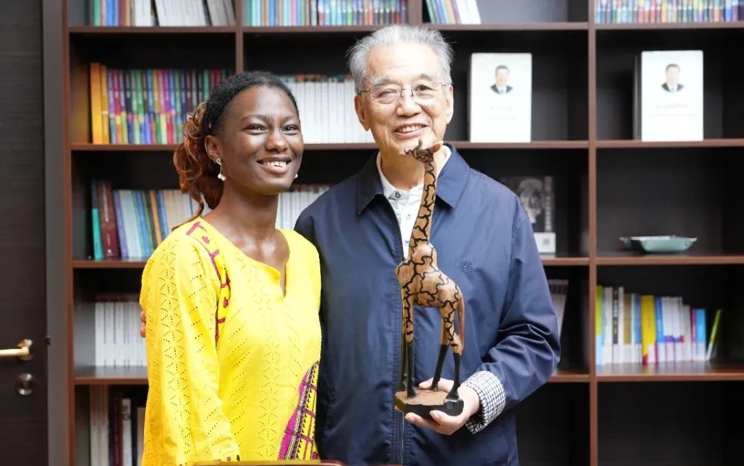 审计专业硕士国际班留学生代表,来自塞拉利昂的贺菲和来自萨摩亚的菲娅向李主席赠送礼品,“这是来自我的祖国的长颈鹿木雕,它象征着勇气与坚韧,以及眺望远方的能力,这与您的优秀领导力和远见卓识特别匹配。”李主席寄语留学生,“多到中国各地走一走,多到中国的审计机关走一走,希望你们在中国学习生活愉快。”