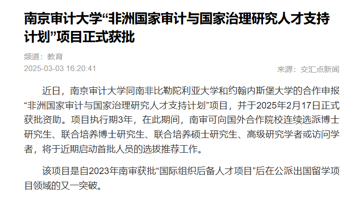 交汇点新闻:南京审计大学“非洲国家审计与国家治理研究人才支持计划”项目正式获批