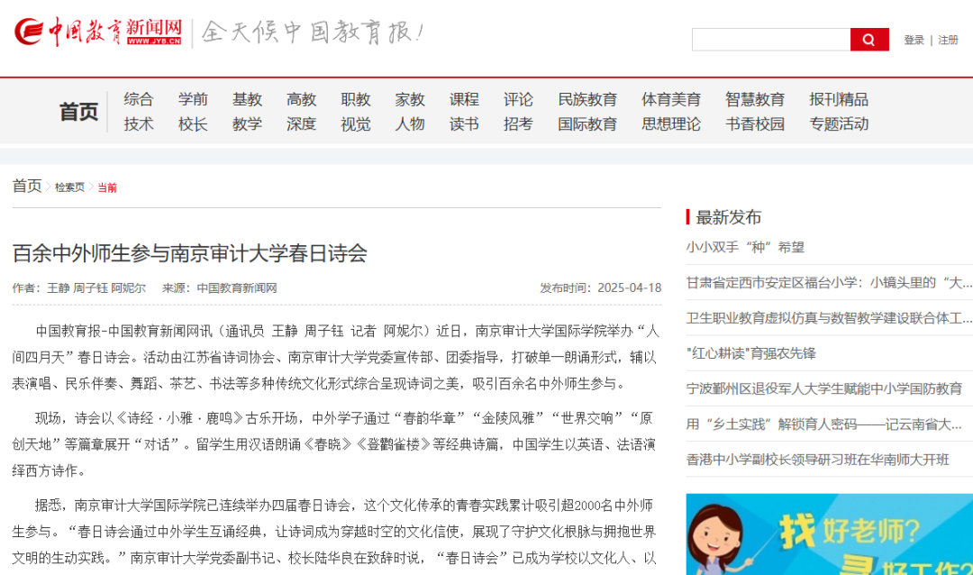 中国教育新闻网:百余中外师生参与南京审计大学春日诗会