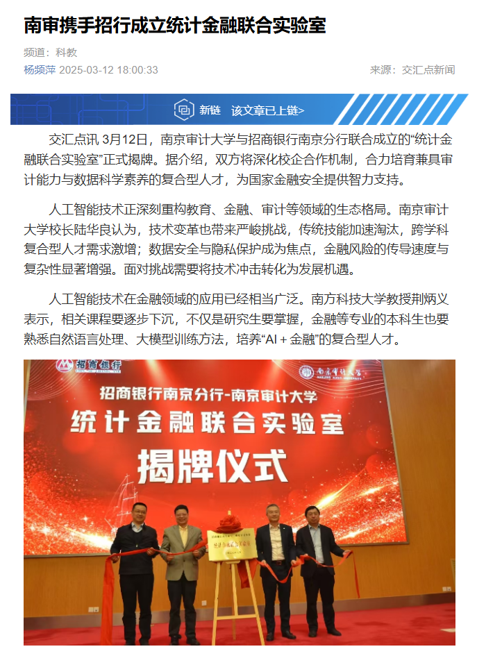 交汇点新闻:南审携手招行成立统计金融联合实验室