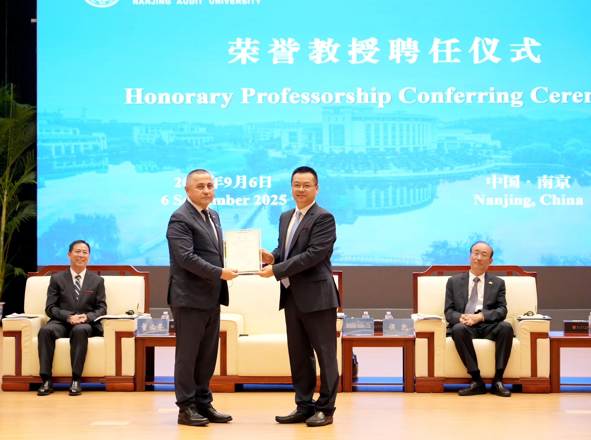 南京审计大学校长陆华良为阿卜杜拉耶夫教授颁发荣誉教授聘书。