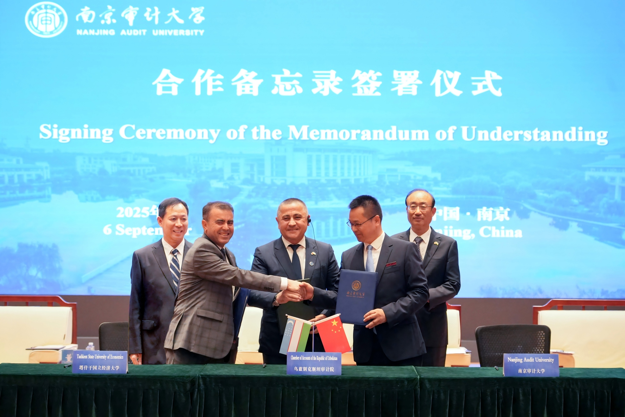 乌兹别克斯坦审计院院长阿卜杜拉耶夫、塔什干国立经济大学第一副校长梅赫蒙诺夫、南京审计大学校长陆华良教授共同签署“南京审计大学与乌兹别克斯坦审计院、塔什干国立经济大学三方合作备忘录”,以及“南京审计大学与布哈拉州立大学双边合作备忘录”。