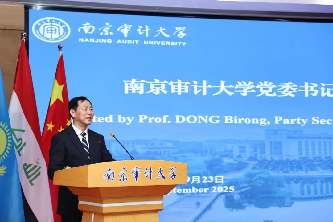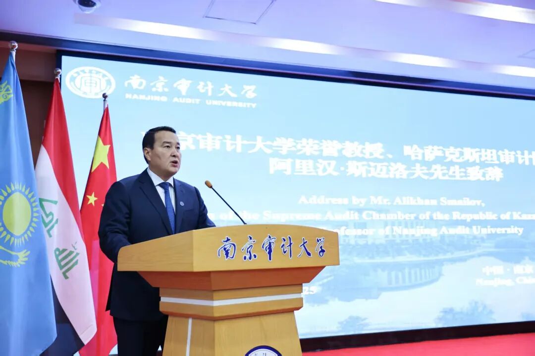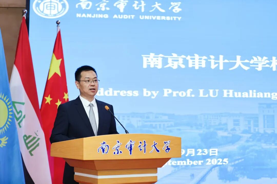 南京审计大学校长陆华良教授致辞,他表示,两位审计长的到访,是促进人文交流、深化审计领域合作的具体行动,意义非凡。期待以此为契机,在中国审计署的指导下,进一步拓展与哈萨克斯坦、伊拉克两国最高审计机关在科学研究、师生交流、联合培训等方面的深度合作,携手为提升亚洲审计能力、推动全球治理体系变革贡献智慧与力量。