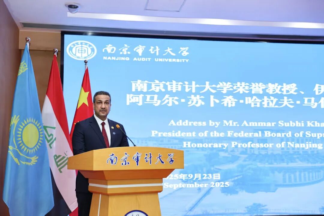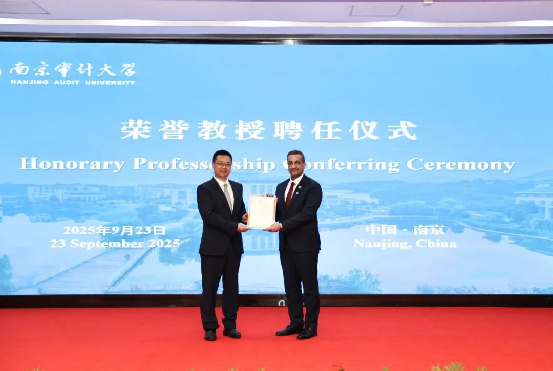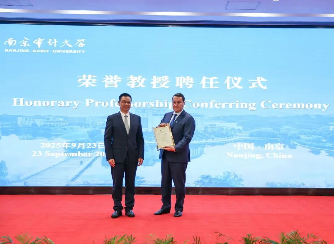 9月23日下午,哈萨克斯坦审计院院长阿里汉·斯迈洛夫和伊拉克审计院院长阿马尔·哈拉夫受聘南京审计大学荣誉教授,聘任仪式在我校举办。