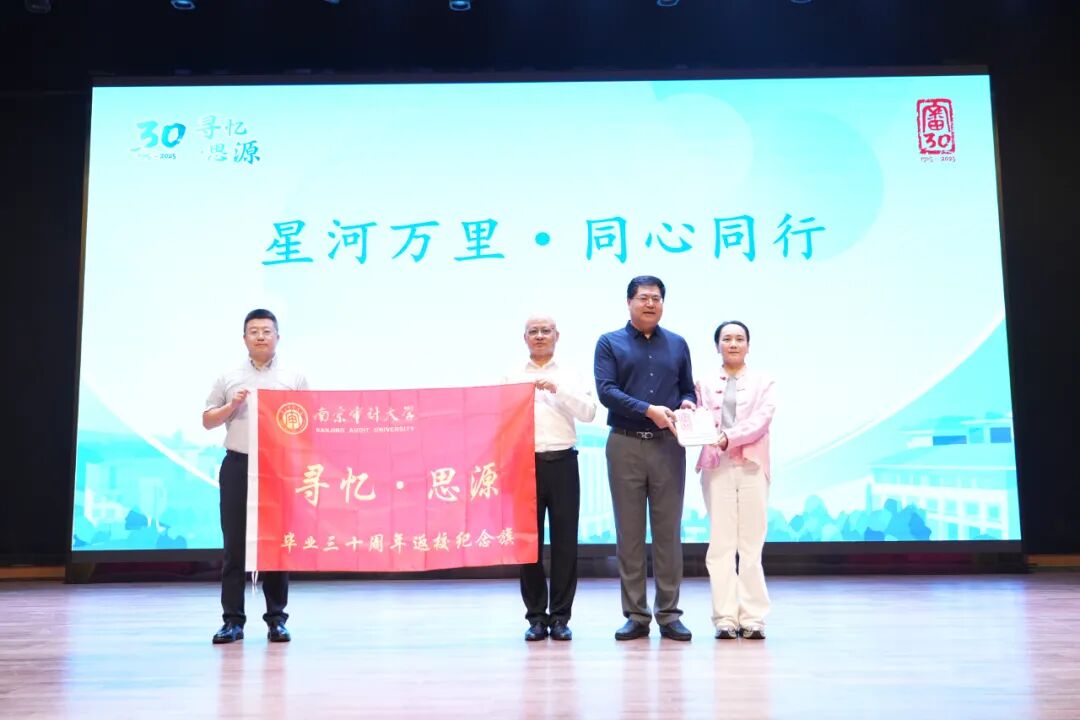 此次返校班级自发捐赠,积极表达对母校感恩之心。现场,李乾文副校长为1995届校友代表颁发捐赠证书,并赠送校友卡。此外还进行了1995届校友与1996届校友“返校纪念旗”和“纪念盘”交接仪式。在校生们为师兄姐们带来了情景诗朗诵《审计之光·辉映星河》。