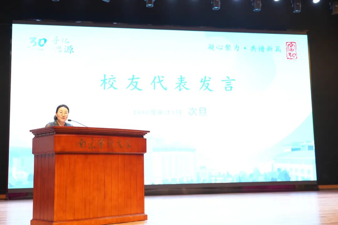 她说:“1995年,你们带着青春、带着爱情、带着美好憧憬,携手从南审校园走向社会;同样是那年6月,我带着责任、带着建设好南审的使命,独自一人从北京来到南京、来到南审。今天不仅是大家毕业30周年返校的日子,也是我同南审结缘30周年的日子。这30年,我们的南审,走过一段追风逐月、风雨兼程、激情燃烧的奋斗之路;南审的你们,走过一段心系母校、相知相守、相濡以沫的同心之路。今天你们携手归来,也是“心系南审”最美的传承!祝愿彼此越来越好!”