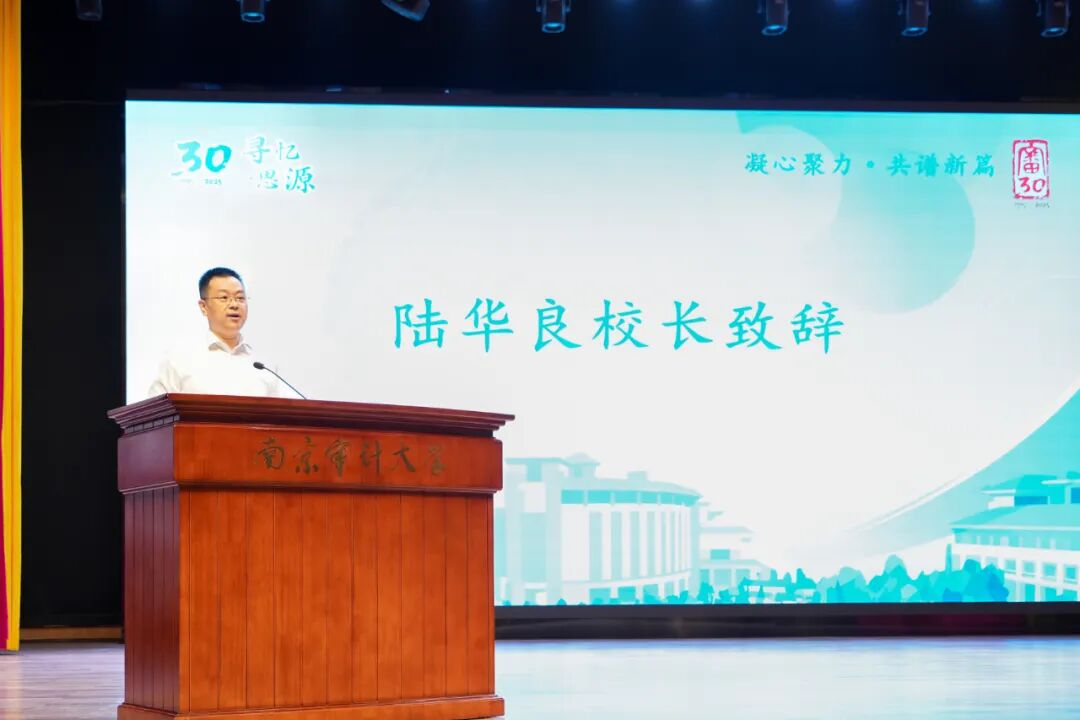 陆华良校长致辞。他代表学校党政领导、全体师生,对参加返校庆祝大会的各位校友和老师表示欢迎,并详细介绍了学校办学来的发展成就。他表示,南审创建于1983年,办学历史可追溯至1951年。三十年前,大家从母校扬帆起航,将校训精神融入血脉,在各个领域辛勤耕耘,为国家经济发展和社会进步注入了强劲动力,为母校赢得了广泛的社会声誉,校友们身上所展现的南审校友文化与精神是引领所有在校学生奋发有为、薪火相传的强大力量。他期望,校友们常回母校,共叙情谊,感受校园新貌,持续为母校高质量发展建言献策、汇聚力量。