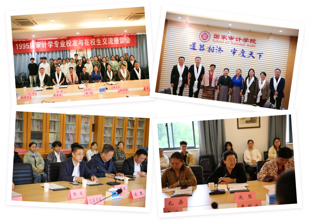 中午,国家审计学院在敏行四楼会议室以“扎根西藏、情系母校”为主题召开1995届审计学专业校友与在校生交流座谈会。西藏自治区审计厅党组成员、副厅长次旦,西藏自治区审计厅固定资产投资审计处副处长、一级调研员巴桑卓玛,西藏大学财经学院会计系副教授扎桑,西藏苏拉供应链管理有限公司董事长戎宝忠等校友重返母校,校党委常委、副校长李乾文,人事处处长祝遵宏,校友工作办公室主任张成,国家审计学院党委书记李卫红,院长王士红,泽园书院党委副书记徐婷婷及师生代表参会。