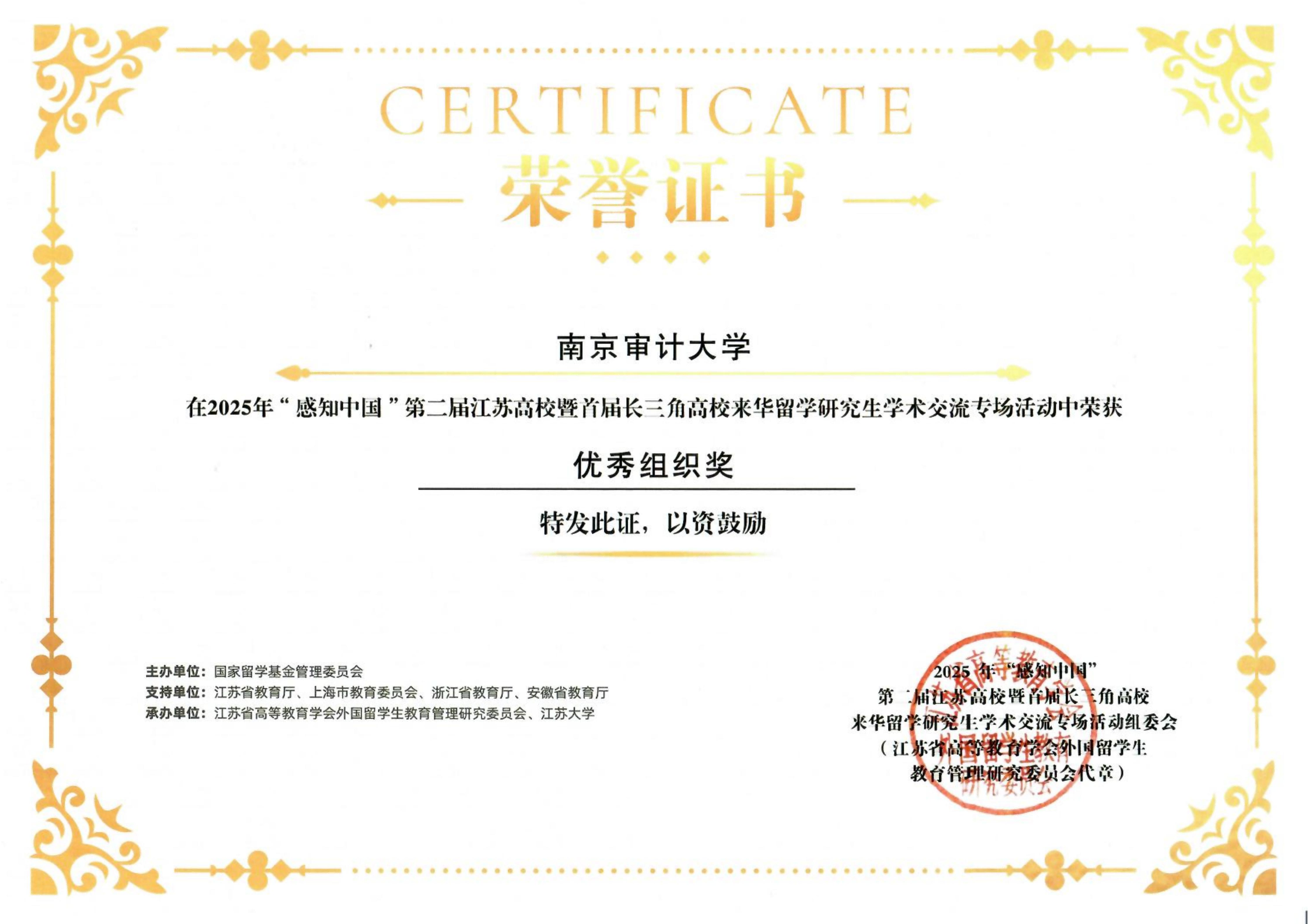 10月25日至26日,2025年“感知中国”第二届江苏高校暨首届长三角高校来华留学研究生学术交流专场活动在江苏大学举行。来自上海、江苏、浙江和安徽的55所高校400余名中外研究生及带队教师参加活动,通过思想碰撞推动学术进步和文化交流,在互学互鉴中实现共同提升。我校留学生院4名学生的论文被录用并受邀参会,获“学术论文奖”一等奖1项,三等奖1项,优秀奖2项,最佳墙报奖1项;南京审计大学获评“优秀组织奖”。
