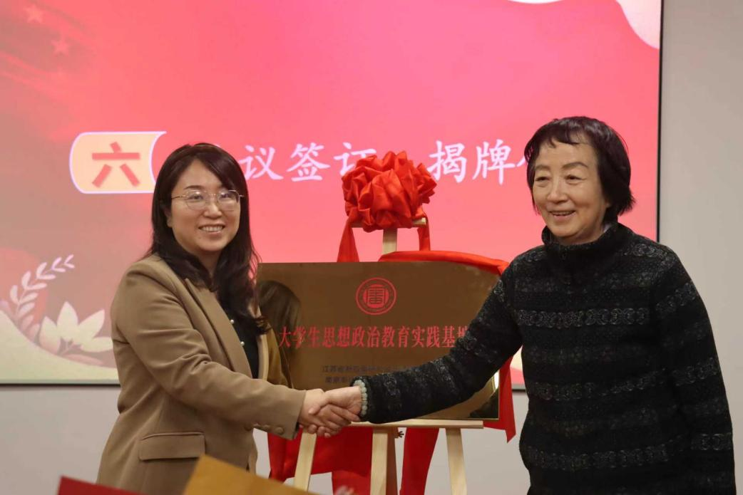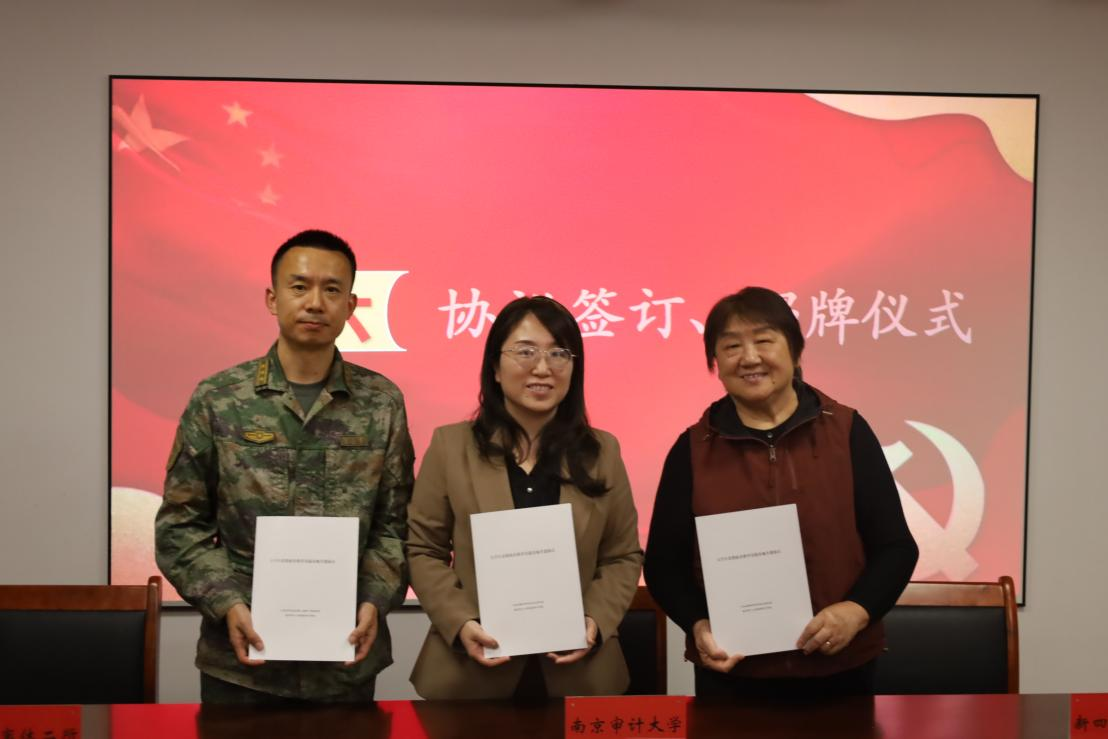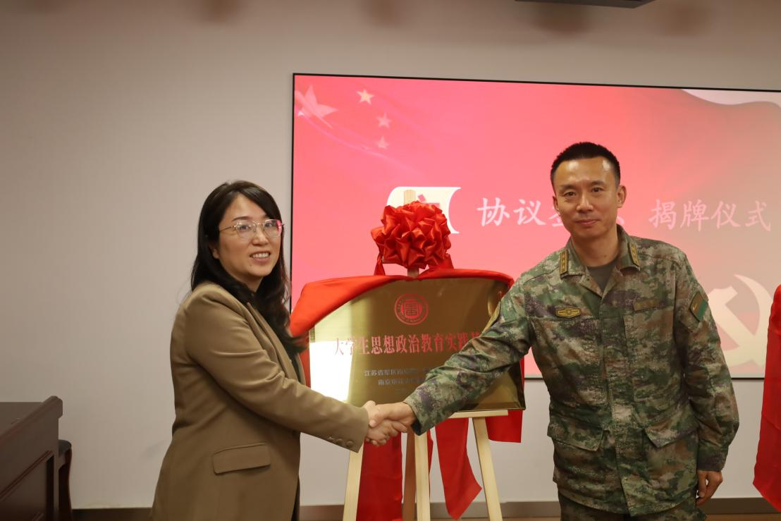 在签约与揭牌环节,南京审计大学国家审计学院、江苏省军区南京第二离职干部休养所、江苏省新四军研究会五师分会共同签署共建协议,并为“大学生思想政治教育实践基地”揭牌。