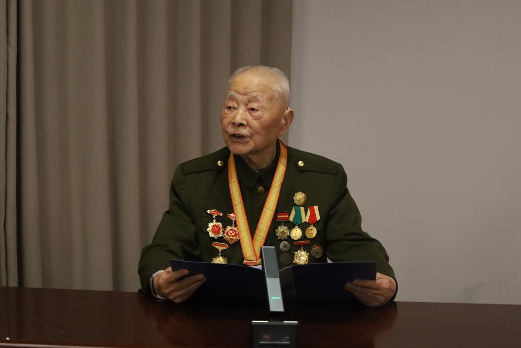在共建活动中,干休所离休干部代表、98岁的新四军老战士陈元桂结合亲身经历,为在场师生带来了一堂生动而深刻的思想政治教育课。陈元桂老战士曾参加苏中兴化敌后根据地抗日游击战、豫东战役、济南战役、淮海战役、渡江战役等战役战斗。荣立三等功6次、四等功4次,授予独立自由奖章、解放奖章、独立功勋荣誉章。
