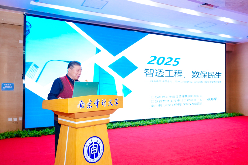 江苏希地丰华项目管理集团有限公司董事长、工程审计学院校友联谊会会长张海军以“智透工程,数保民生”为题,介绍了如何构建全流程数字化审计体系实现风险精准预警。
