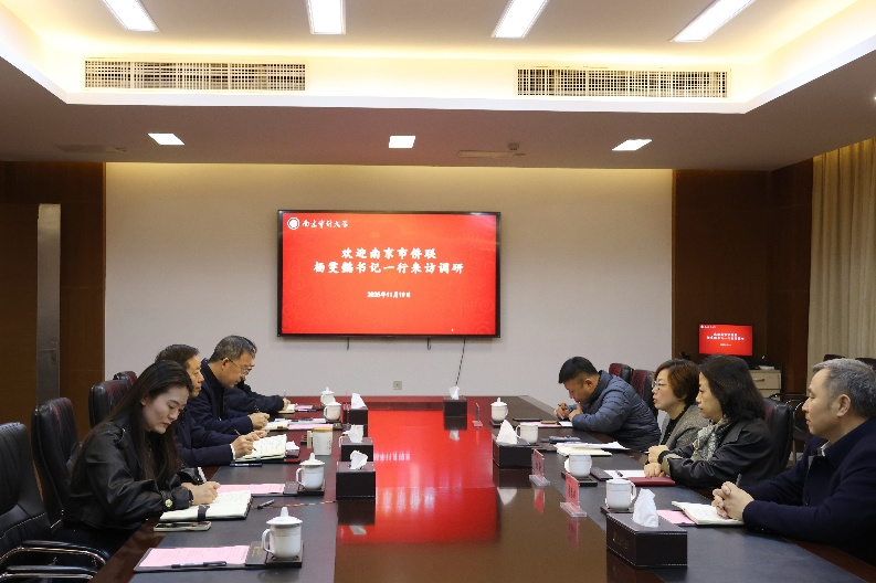 11月19日,南京市侨联党组书记杨雯懿一行来校调研,校党委副书记陈中建出席座谈会,人事处处长祝遵宏和党委统战部相关同志参加座谈。